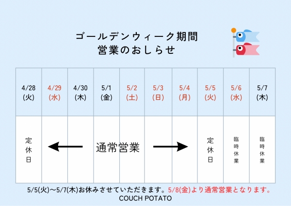 COUCH POTATO G.W営業日のお知らせ