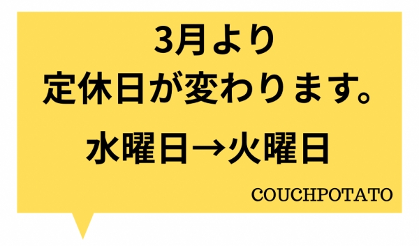 3月から定休日変更のお知らせ 2026-02-14 12:54:48 カウチポテト でございます📝2/12リニューアルOPENを無事迎えて本日3日目となりました🔥早速なのですが、定休日を3月より変更致します🙇♀️現在水曜日定休ですが火曜日定休に変更させて頂きます。3月以降に火曜日でご予定立てていただいた方には申し訳ございません。ご理解の程よろしくお願い致します。それでは引き続き新生カウチポテト をよろしくお願い致します🤲
